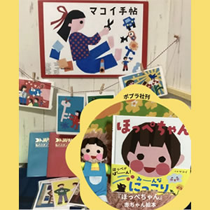 | みんな笑顔になれる絵本『ほっぺちゃん』(ポプラ社)と切り絵のポストカードなど、ぜひお越しください! |